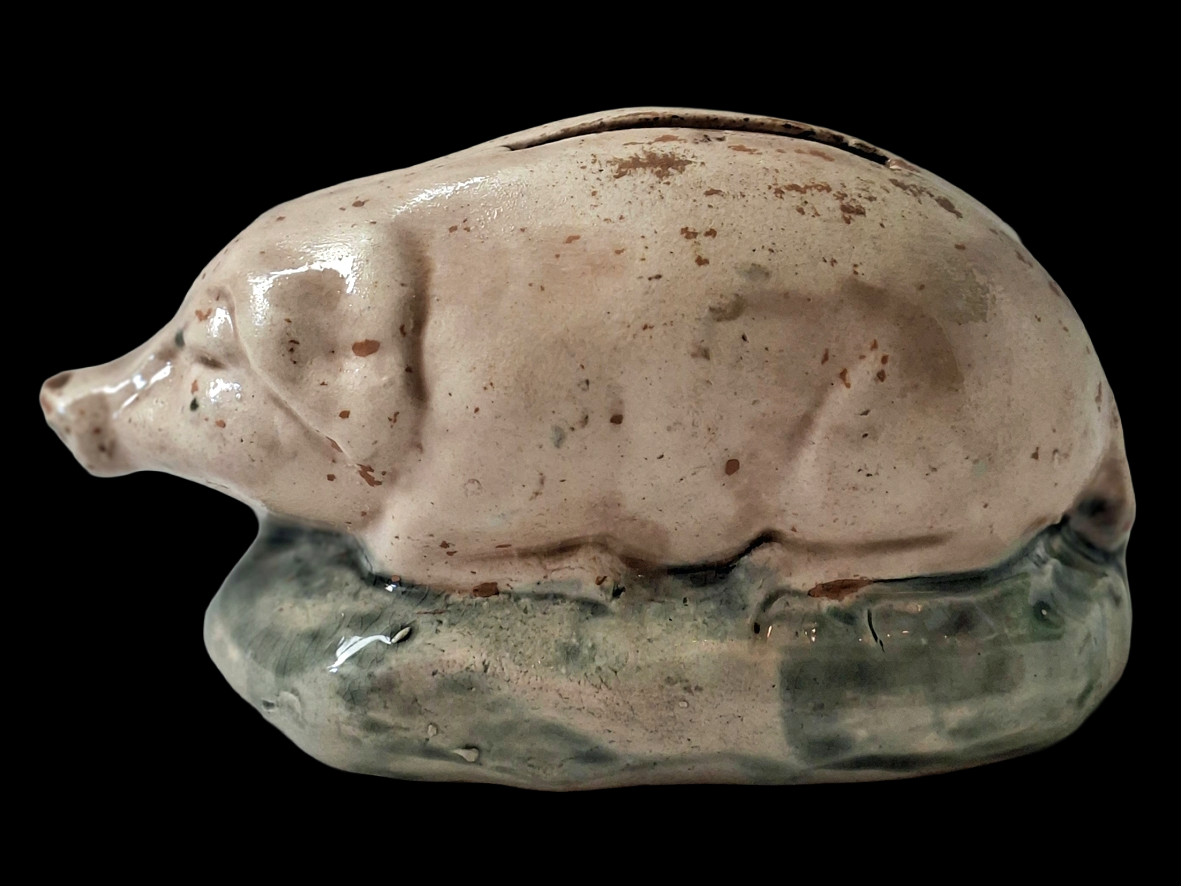 Frankrijk. Beschilderd gips. ± 1900. Lengte 26,5 cm. Links het spaarvarken in originele staat. Rechts zie je wat te veel (en hard) poetsen kan aanrichten met beschilderd gips. Nooit doen dus…