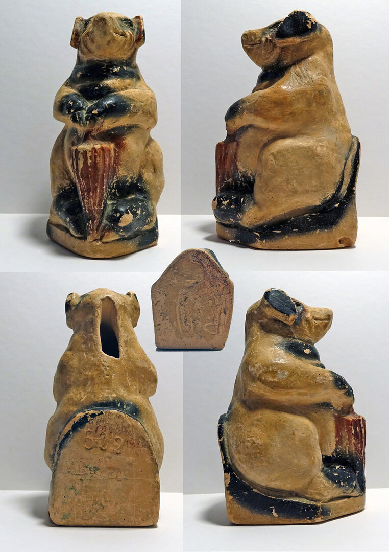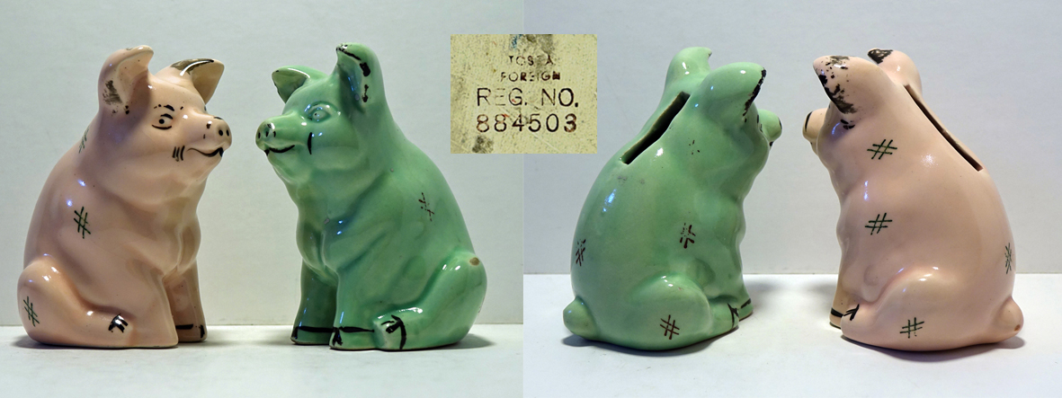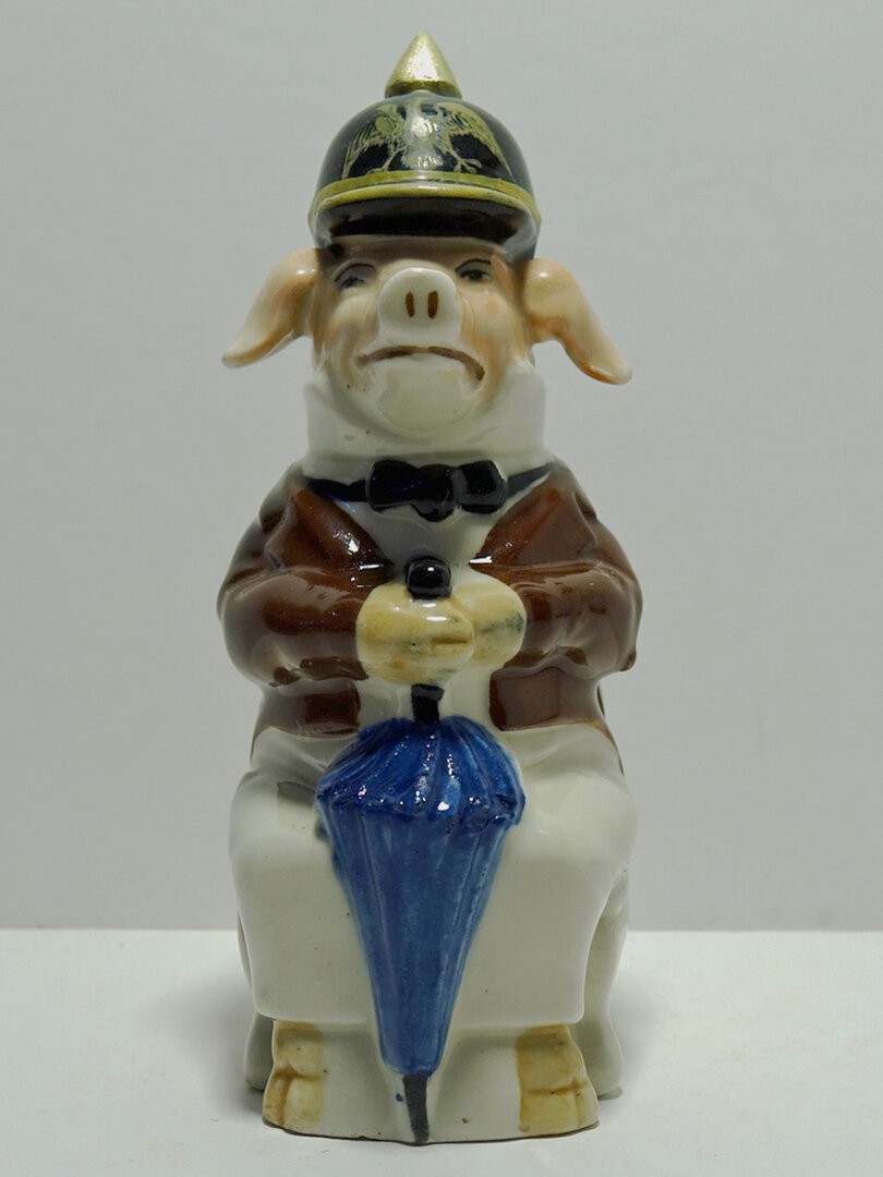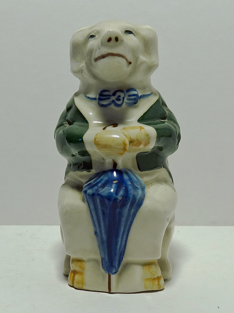 Revol, Saint Uze. Art Deco, periode ± 1920-1939. Hoog 13,5 cm. 4 zittende heren (spaarvarkens!) met paraplu. De paraplu gold ook als symbool van waardigheid. Er zijn meerder kleuren. Plus een iets grotere variant, waarvan er in de 'galerij'2 zijn afgebeeld.