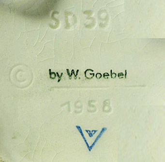 W. Goebel. Links: SD 39, crème (1956). Lengte 12,5; hoogte 11 cm. Midden: SD 40 "Foreign" (1957). Lengte 19,5; hoogte 16 cm. Rechts: SD 39 wit "Arbeitsmuster" (1958). Lengte 12,5; hoogte 11 cm.
