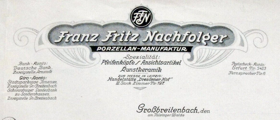 - FFN Grossbreitenbach, tot 1973 gevestigd in de gelijknamige plaats in Thüringen. Over de bedrijfsgeschiedenis:• Porzellanmanufaktur Franz Fritz, 1874 - 1905, pijpenkoppen, souvenirs en kunstkeramiek;• Doorstart 1906 - 1971: Franz Fritz Nachfolger (FFN Großbreitenbach);• 1971: Opname in de “ VEB Porzellanwerk Ilmenau”, gesloten in 1973.