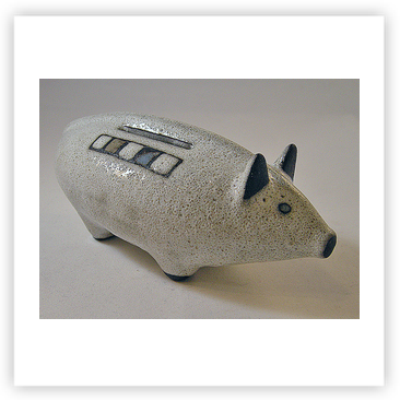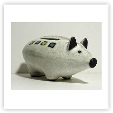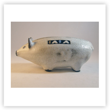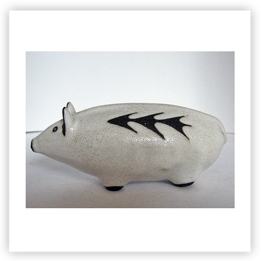 De beide originele spaarvarkens met de initialen KvM in mijn collectie schrijf ik toe aan de Vier Paddestoelen. De andere zonder initialen zijn, veelal gemaakt in serie en in opdracht, gemaakt in Pottenbakkerij ' t Kalkoentje uit de periode 1953-1976. Een met het "merk" Rhenus. Lengte ± 15,5 cm. Decor Art Deco.