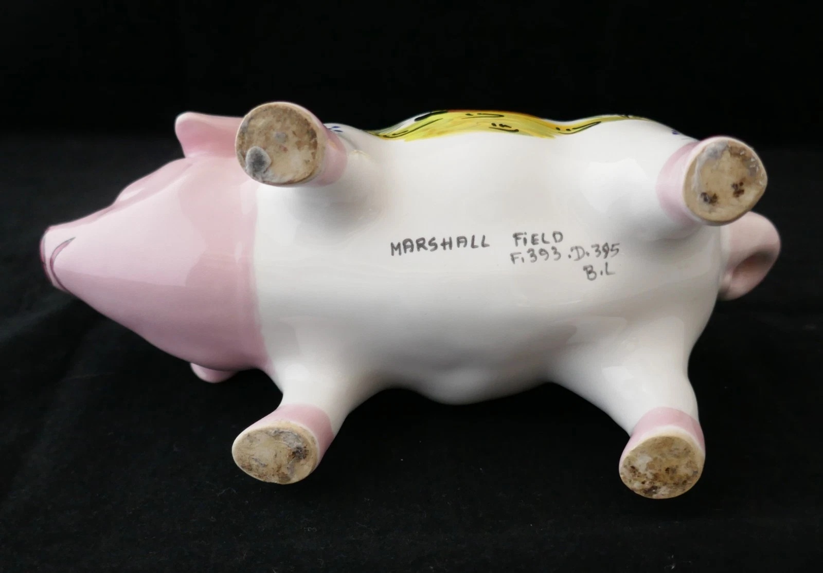 Het blijkt dat Henriot (en/of HB) ook met onderaannemers werkte. PARRY & VIEILLE was een van de bedrijven die betrokken zijn geweest bij de productie van Quimper faience. De samenwerking met Henriot/HB vond plaats rond de jaren 1920 tot 1950. Dit was een periode waarin veel aardewerkfabrieken in Quimper samenwerkten of fuseerden om de productie en distributie te optimaliseren. Bij P&V werden de spaarvarkens gewoon voorzien van het Henriot of HB kenmerk. Maar hier lijkt het er (let wel: mijn theorie!) op dat ze ook een eigen lijn hadden op basis van de mal 393. Die decoreerden ze dan volgens eigen inzicht. Omdat deze niet voldeden aan de standaard van Henriot / HB werd dat hun eigen merk. Dit lijkt mij een logische verklaring voor het PV merk onder een Henriot/HB spaarvarken. Periode: 1920-1950. Lengte 20 cm.