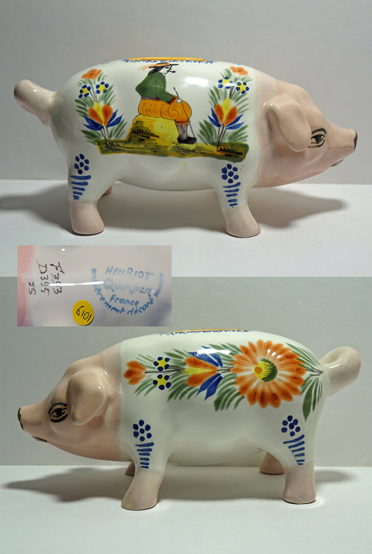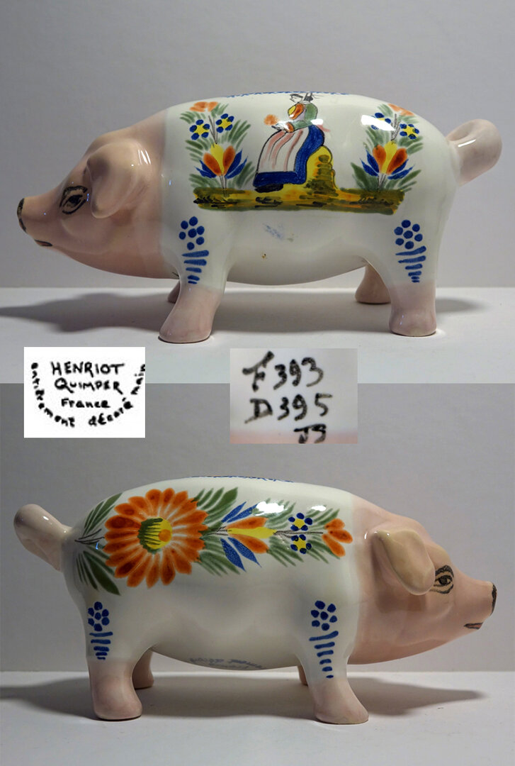 Naast spaarvarkens uit mal 393 maakte HenRiot (1922-1968) ook andere types. De grijze zonder traditioneel decor (!) is vermoedelijk gemaakt voor de export naar de USA, een belangrijke afnemer van HenRiot. De andere heeft het traditionele Bretonse boeren decor. Waarvan ik zowel de boer als de boerin in mijn collectie heb.