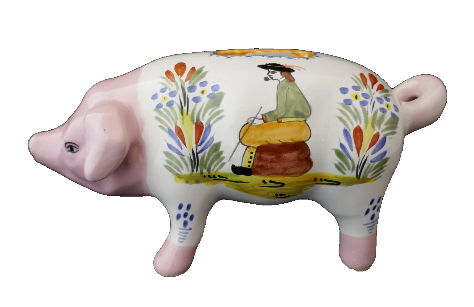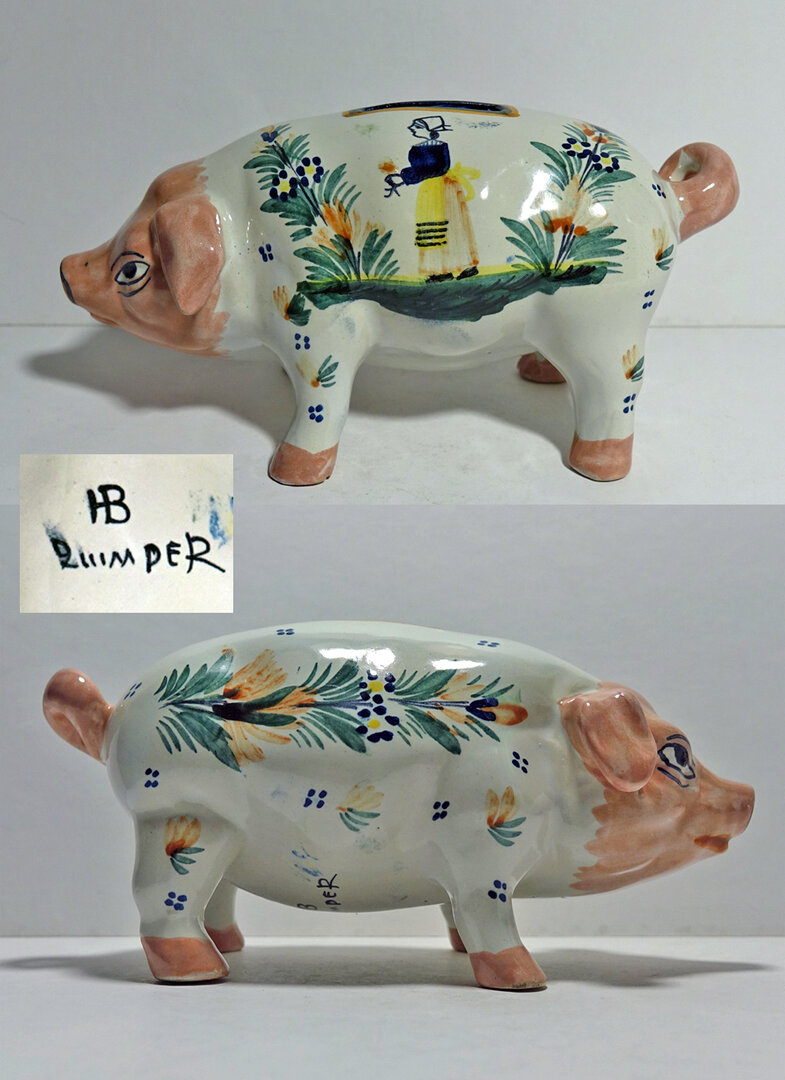 Een merkloze, "signed all over" Quimper - HenRiot/HB. 20 cm lang. Een minder verfijnde kleisoort is hiervoor gebruikt, voelt zwaarder aan en is wat grover. En het motief/ de decoratie is verre van het traditionele dat we van Quimper gewend zijn. Verder is de geldgleuf erg breed; of dat bewust is of een "ongelukje" is niet te zeggen. Wie de maker is, is ook niet duidelijk. De Franse verkoper markeerde het als Devres, maar dat betwijfel ik.